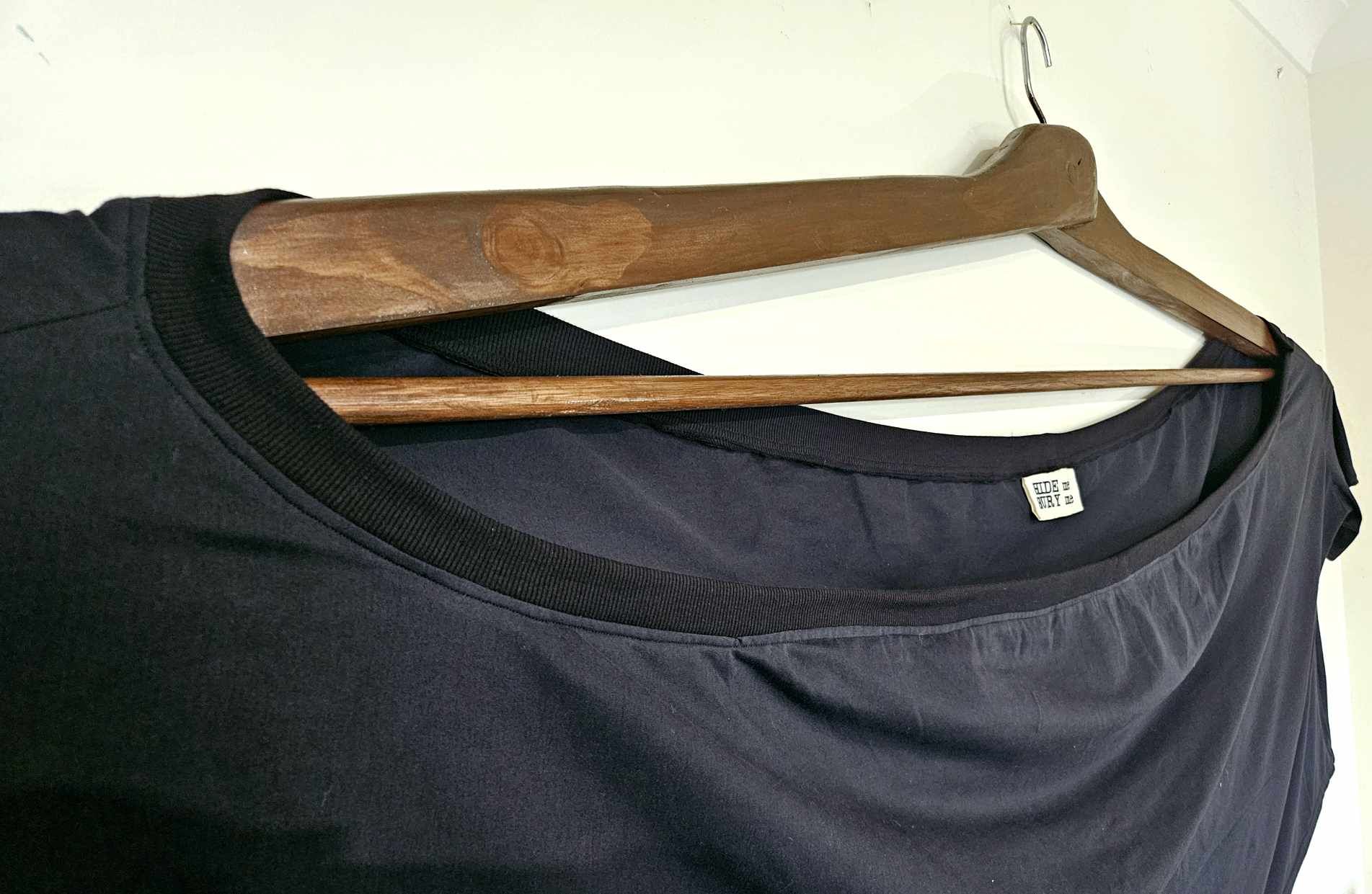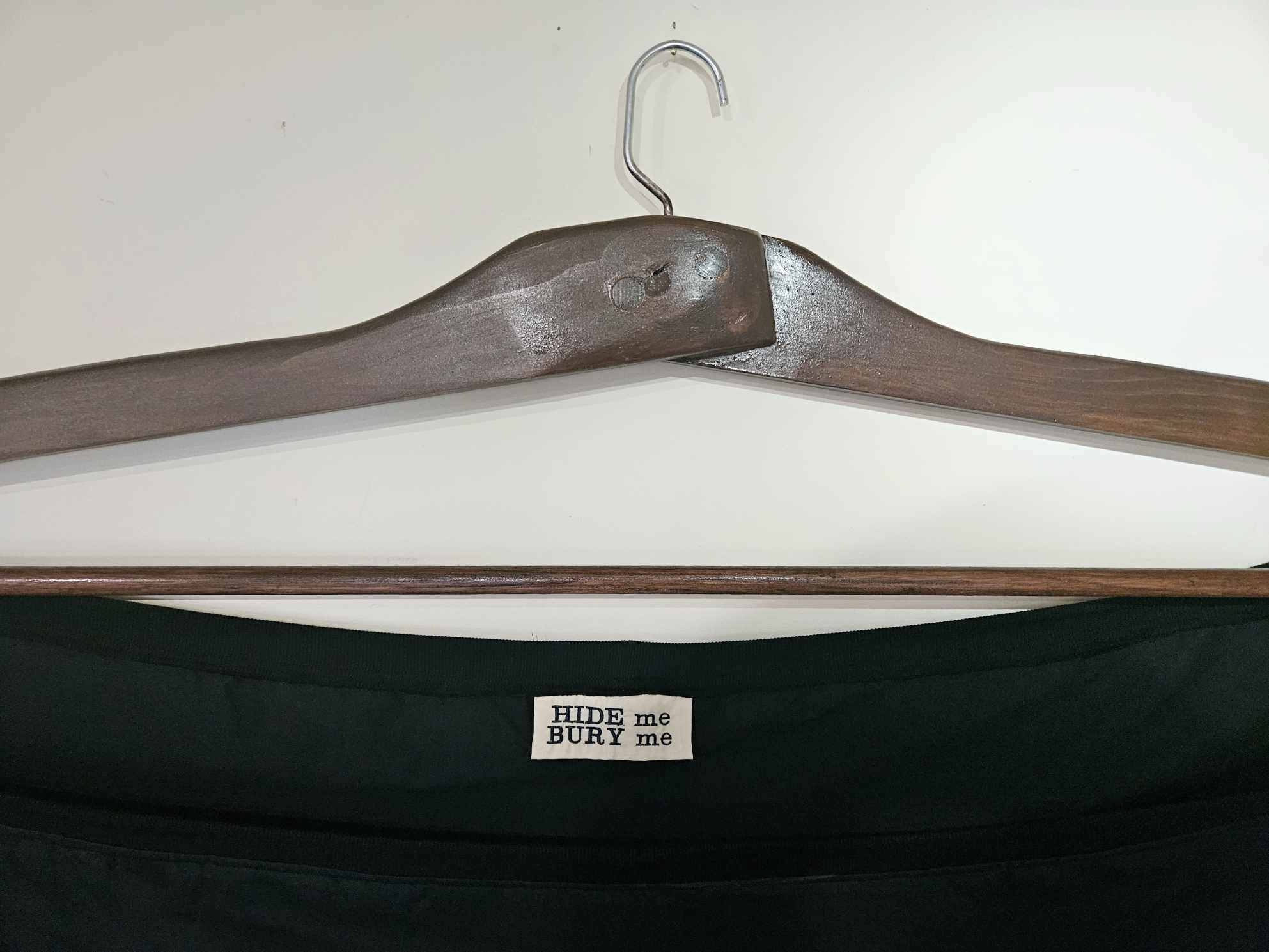 This piece is a caricaturistic exploration of fashion companies’ treatment of plus sized customers. Plus ranges are rarely available in store – why is this? Brands don’t want fatness associated with their image, but they want our business, our money. In store, plus sizes are segregated, lifeless and encourage shame. This t-shirt is emblematic of the lack of style, luxury, or effort in the plus size market. You get what the brand can be bothered to make for the sake of appearing inclusive. The piece’s distorted scale offers levity to an otherwise offensive offering. Gallery patrons are invited to take the hanger from its display, walk around with it, and to try on the garment, to feel the gravity of shopping as a fat person. Do you feel all eyes on you? Do you feel awkward, embarrassed? Does it feel stylish? A celebration of style? Or perhaps a burial shroud. The brand label states ‘HIDE me BURY me’ – is this a message the fashion industry wants us to buy?